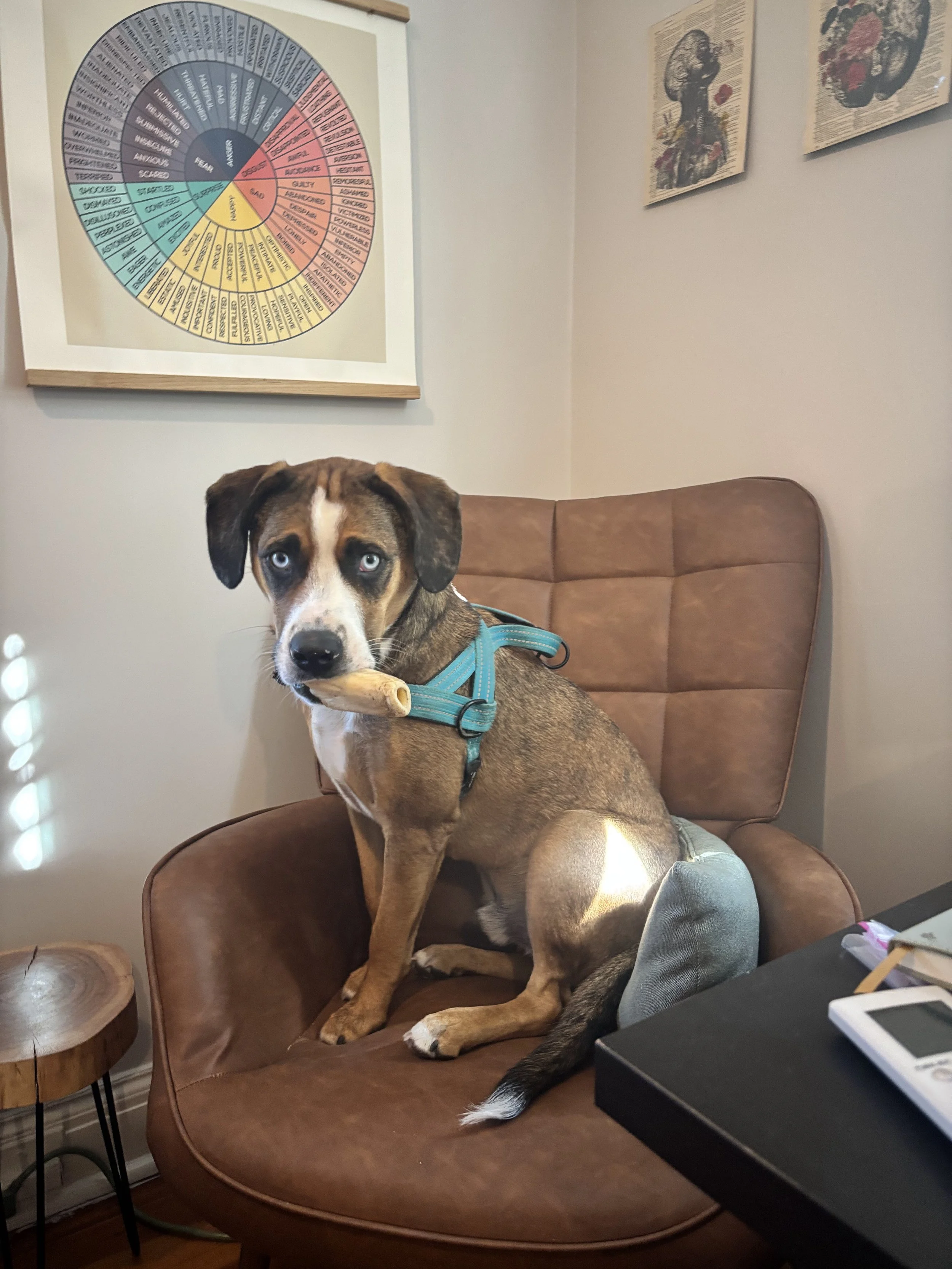 With his sparkling blue eyes and an irresistibly goofy demeanor, this playful puppy brings joy wherever he goes. His mischievous antics often call for laughter, especially when he’s prancing around in the background of a virtual session. Despite all his energy, underneath that playful spirit lies an innate ability to comfort; he always seems to know when someone needs a warm embrace. Whenever anyone feels down, he's right there, offering hugs that soothe the soul. As he grows, his hopes remain high that this charming little pup will harness his delightful personality and compassionate nature to become a therapy dog one day.